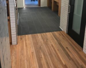 In addition to the locker room flooring, we also designed and installed custom teak shower flooring for the men’s shower area. Teak’s natural resistance to water, mold, and mildew makes it one of the best materials available for wet area flooring solutions, especially in high-traffic environments like athletic facilities.